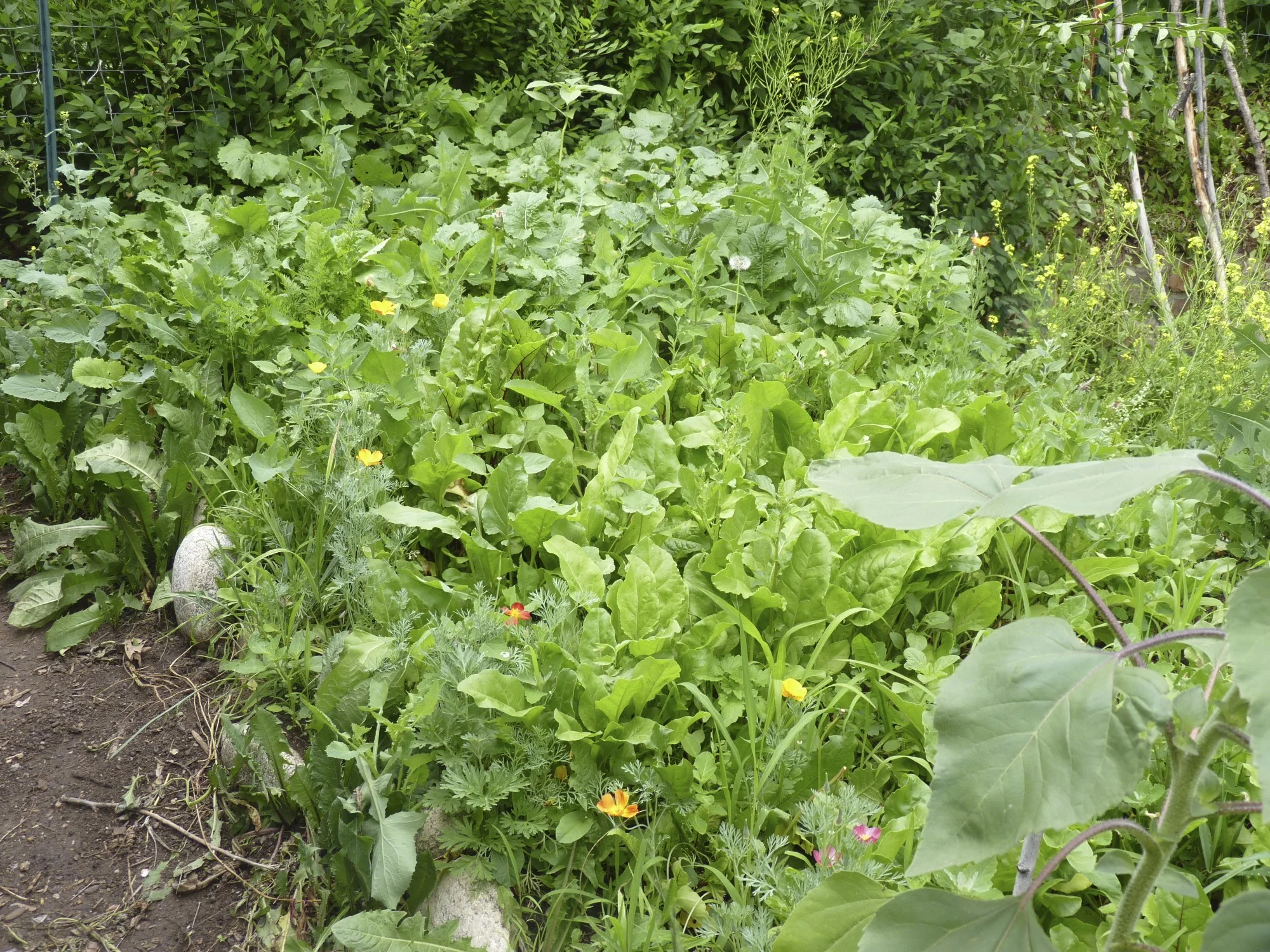 Alongside the chard and Russian kale, mustard greens are allowed to finish their life-cycle. Their yellow blooms add beauty, are tasty in salads and appreciated by bees. They help repel harmful insects. In the rear you can see yarrow. Although it gradually spreads and needs to be managed, yarrow is an excellent companion plant, attracting many beneficial insects, including ladybirds (aka ladybugs) and beautiful dragonflies. It has a protective energy for the garden.
