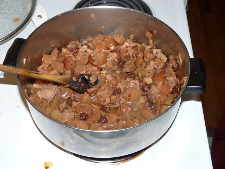 /When I was a child in Britain, many of our Halloween customs were associated with the apple harvest. All of us had wonderful heirloom varieties of apples in our gardens, both eating apples and large green cooking apples. We played bob apple, snap apple and 'pass the apple' and made toffee apples as a special treat. Meanwhile, my mother and I made huge quantities of apple chutney. This year, after so much rain all season, Boulder has an unprecedented apple harvest. Here's an example of a typical Alandi apple chutney recipe.
