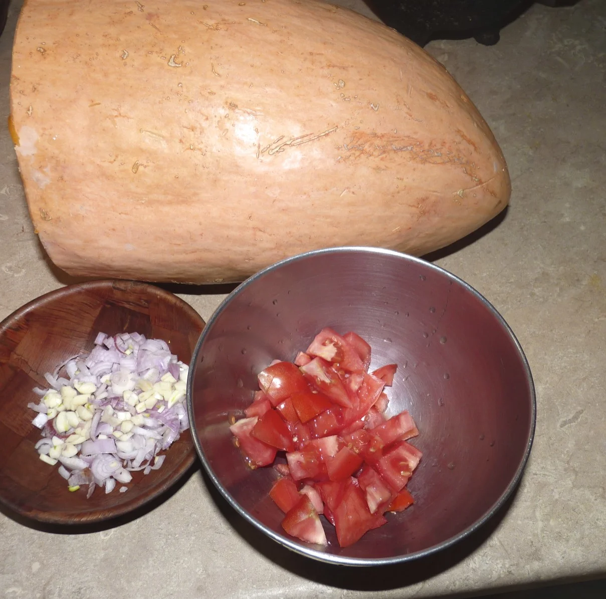 Bake the squash at 400'F. Meanwhile, prepare the tomato, shallot and garlic. Heat olive oil and fry the garlic and shallot until the shallot becomes translucent. Then add the tomatoes and cook until soft. Set aside.