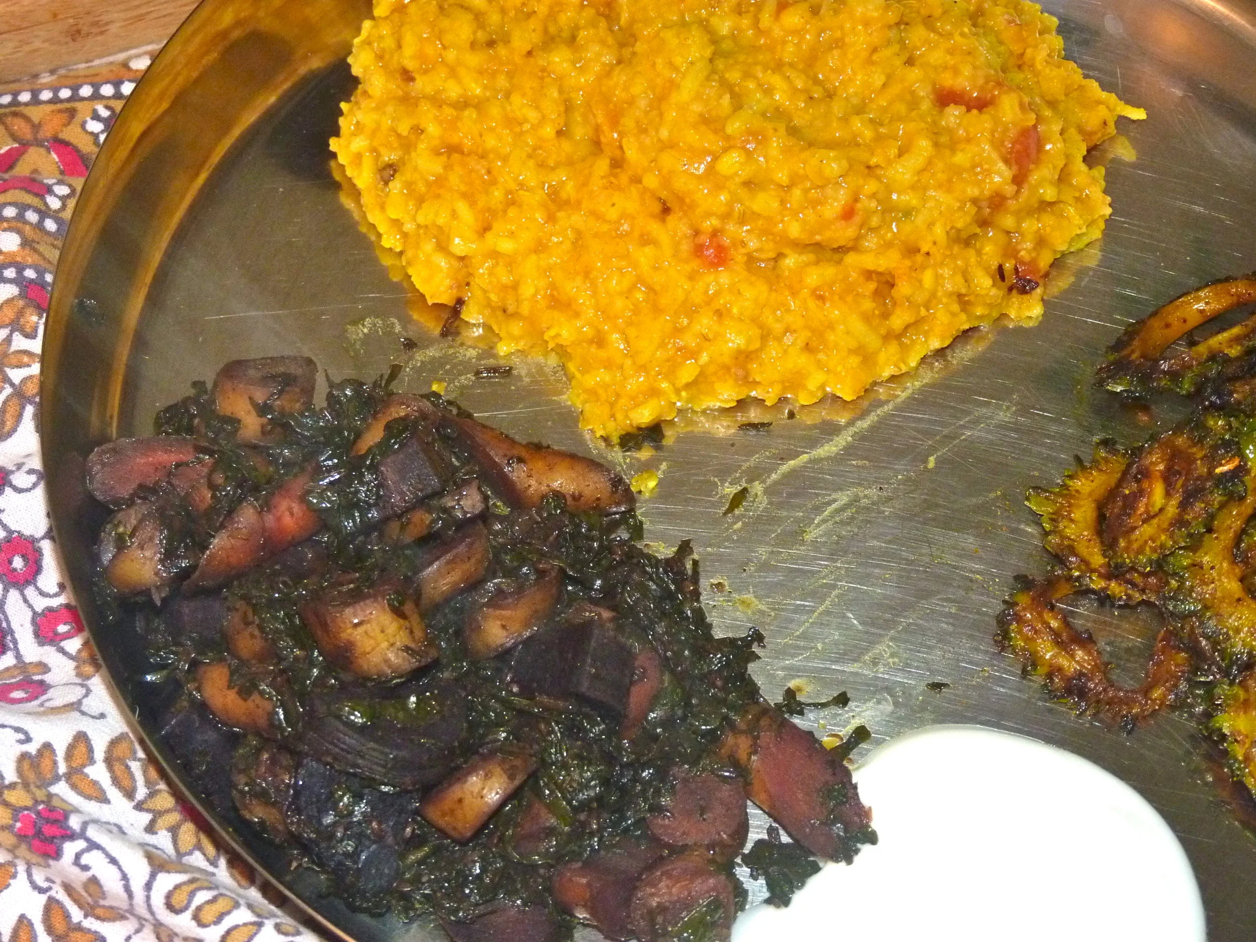 Now add the carrots, fenugreek greens and salt and stir well. Cover and cook on medium heat, for about 20-25 minutes, adding a tablespoon or so of water if needed to prevent sticking. Stir from time to time.