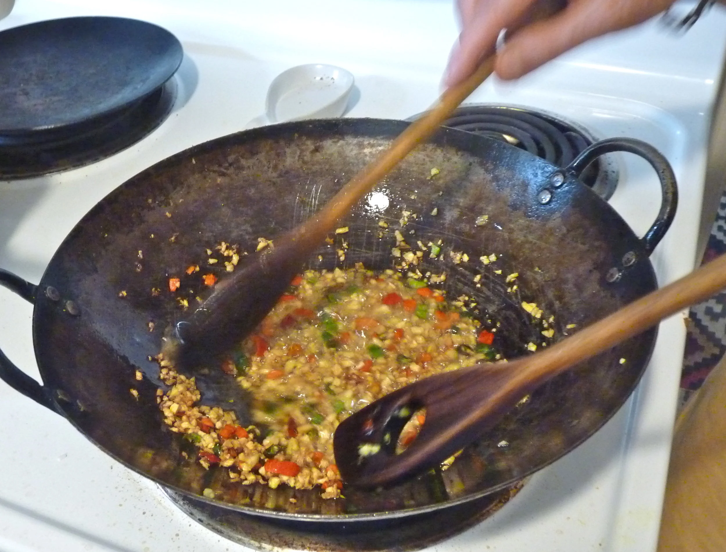 Heat the oil in a saucepan over medium heat. Once it is hot, add the cumin seeds and fry until they darken slightly, about 20 seconds. Add the ginger and chilies and continue frying for several more minutes, until the ginger begins to brown slightly. Remove from the heat and stir into the peach mixture.