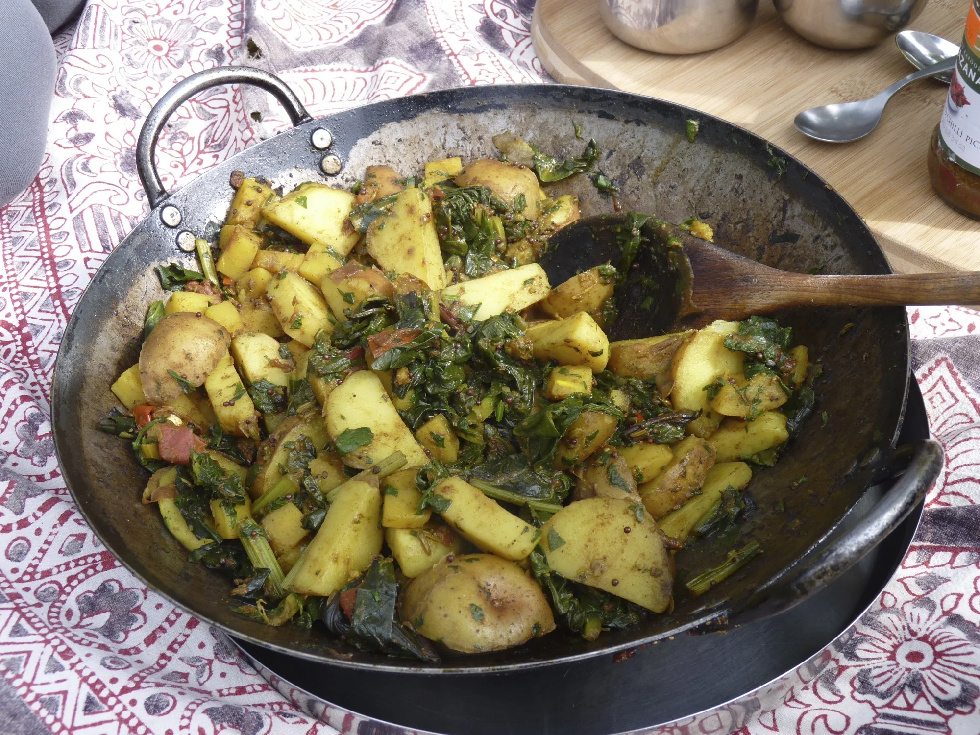Now add the tomatoes and turn the heat up to medium. When the tomatoes have softened, add the potatoes, squash and chard and stir carefully until the vegetables are coated with the spices.